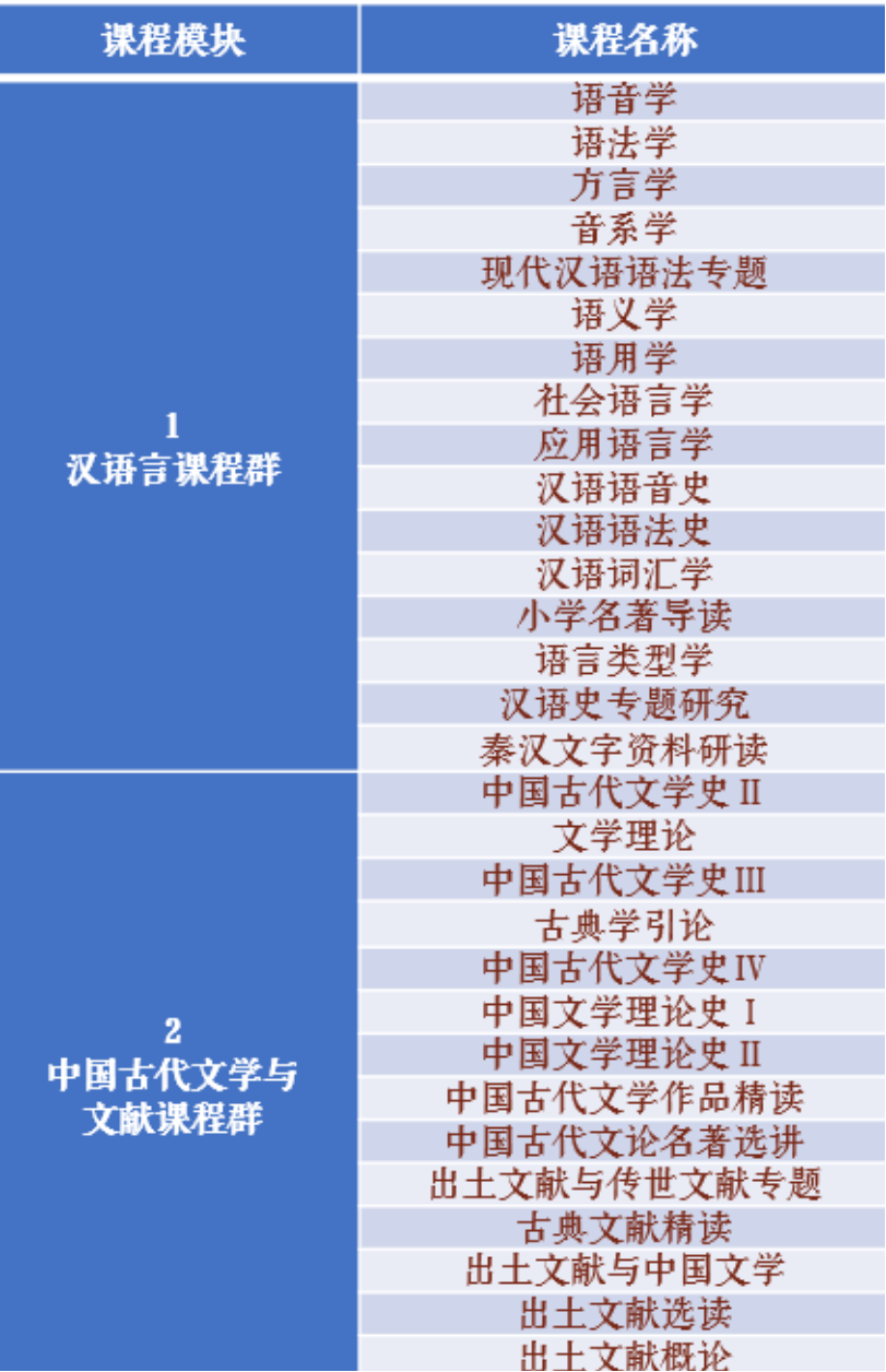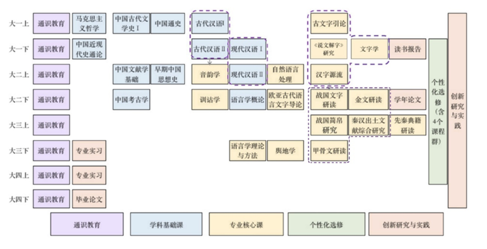 在“学科基础课”中,全面覆盖语言学(古代汉语、现代汉语、语言学概论)、考古学(中国考古学)、古典文献学(中国文献学基础)、古代文学(中国古代文学史)、历史学(中国通史)、哲学(中国哲学史)等学科门类。“专业核心课”重视古文字相关核心课程结构完整、层次清晰(古文字引论、《说文解字》研究、汉字源流、欧亚古代语言文字导论)、重点突出(甲骨文研读、金文研读、战国文字研读、战国简帛研究、秦汉出土文献综合研究)的同时,不忘夯实相关传统核心课程,包括文字学、训诂学、音韵学、舆地学、出土文献综合研究、先秦典籍研读、语言理论与方法、自然语言处理等。“个性化选修课”开设“汉语言”“中国古代文学与文献”“古代西域语言文字”“国学原典”四个课程群,为学生提供研究方向的个性化选择。
